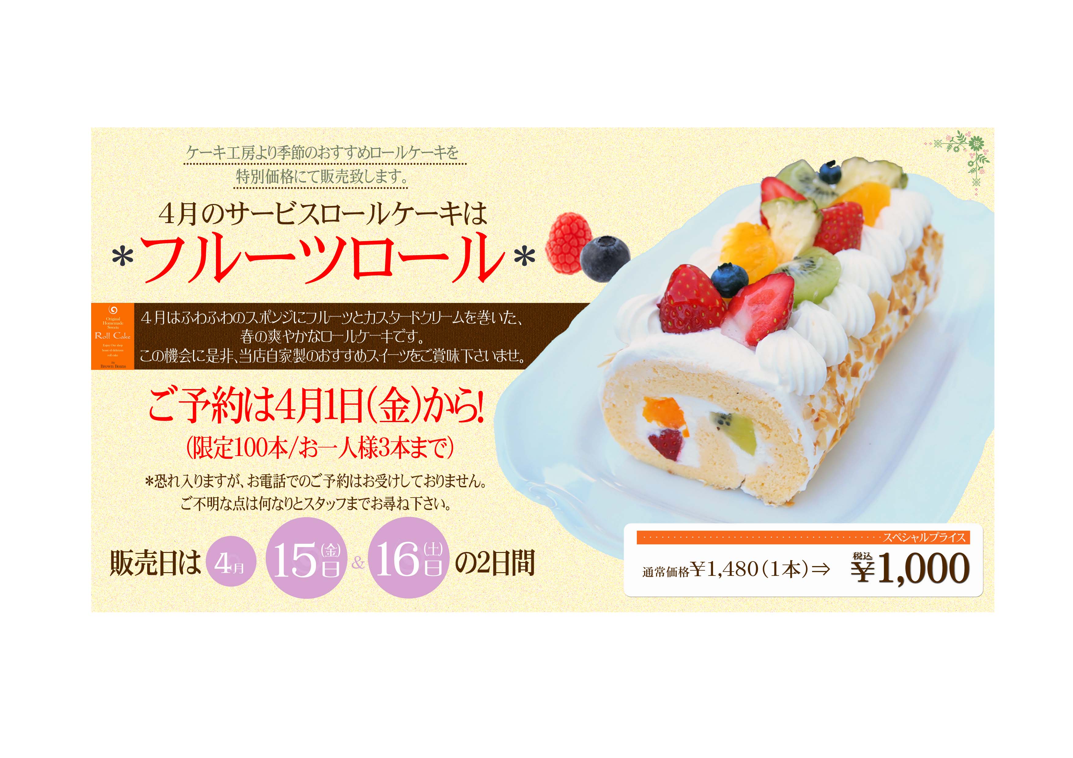 4月のサービスロールケーキ、フルーツロールは完売致しました!!