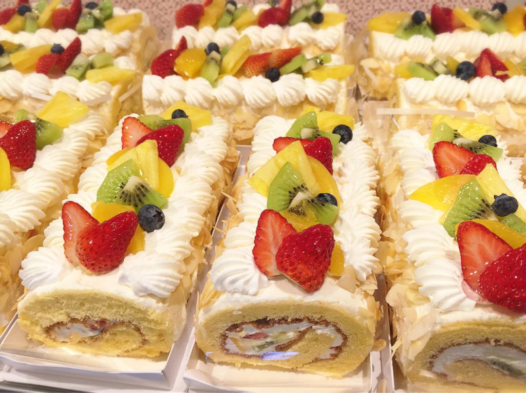 生クリームとカスタードクリームとフルーツを巻いたフルーツロールケーキです。
