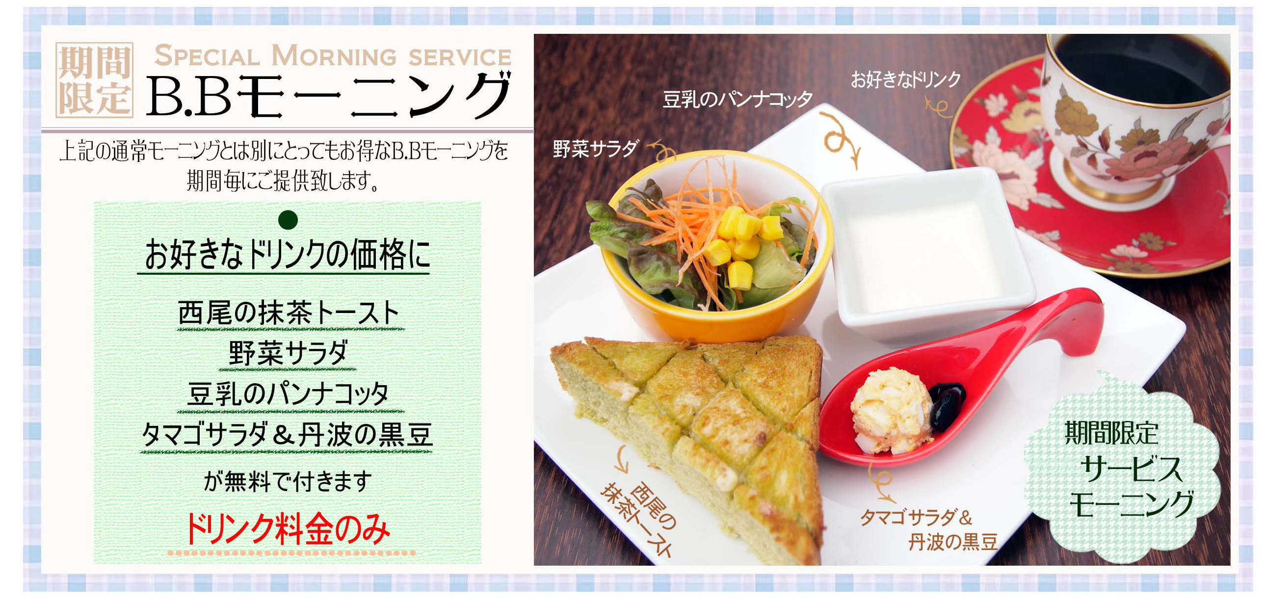5月1日 日曜日の朝からスタートするBBモーニングです!! 去年も大好評だった抹茶パンのトーストです。 ちょっと小さめですが、西尾産の抹茶をたっぷり練りこんでいるので 抹茶の風味を十分にお楽しみいただけます。 今回は抹茶パンに合わせて、和風モーニングにしてみました。 おすすめは、豆乳のパンナコッタで、とろけるような柔らかさと なめらかさ、体に良い豆乳をデザート感覚で食べて さえた頭で一日をスタートすることができます 玉子サラダや丹波の黒豆など、良質なたんぱく質を含んでいるので 体作りに必要な栄養素を朝から十分に取って 体を動かしましょう