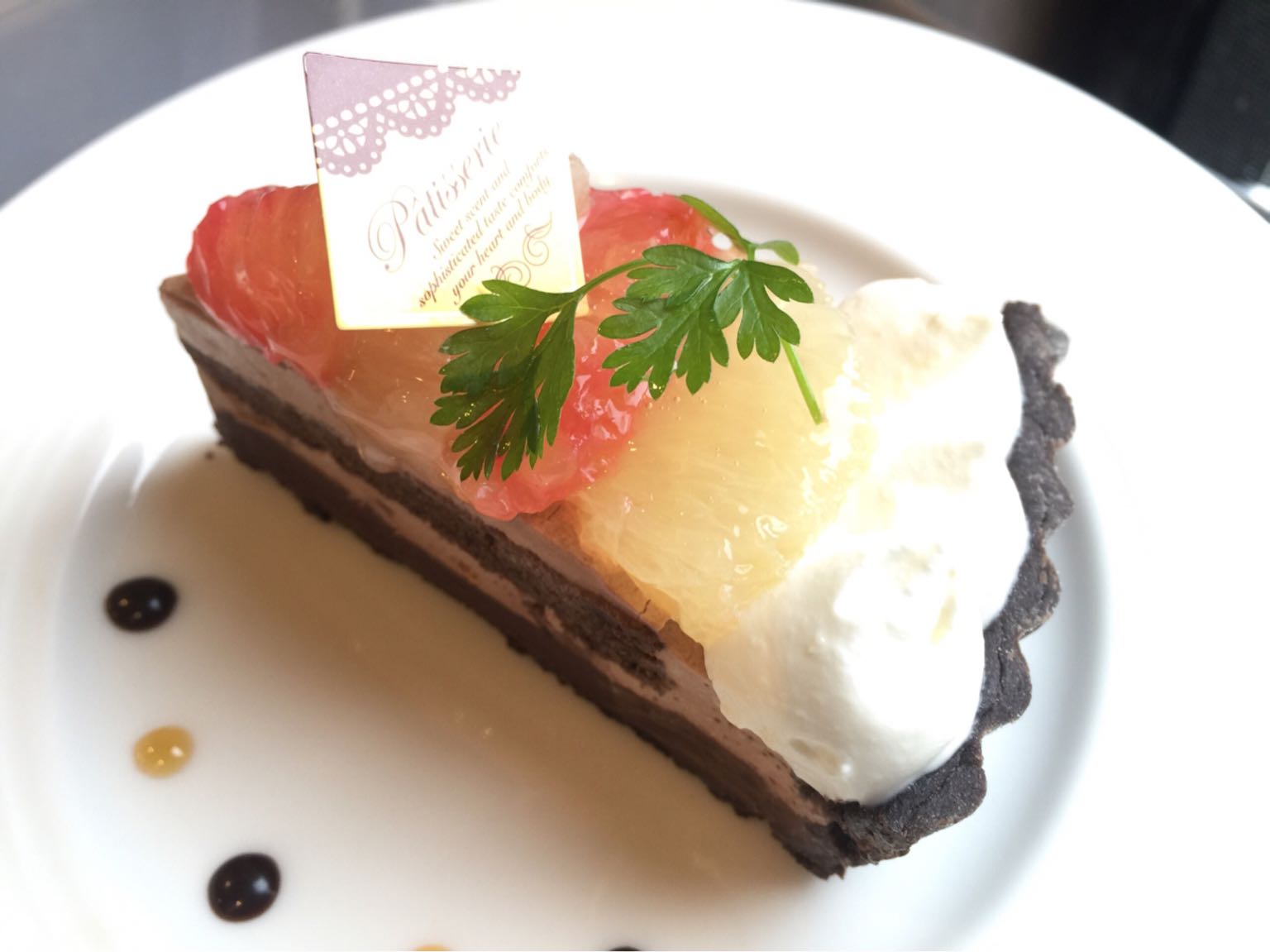 サクサクのほろ苦いタルトと、生チョコ、ショコラクリーム、チョコのスポンジを重ね