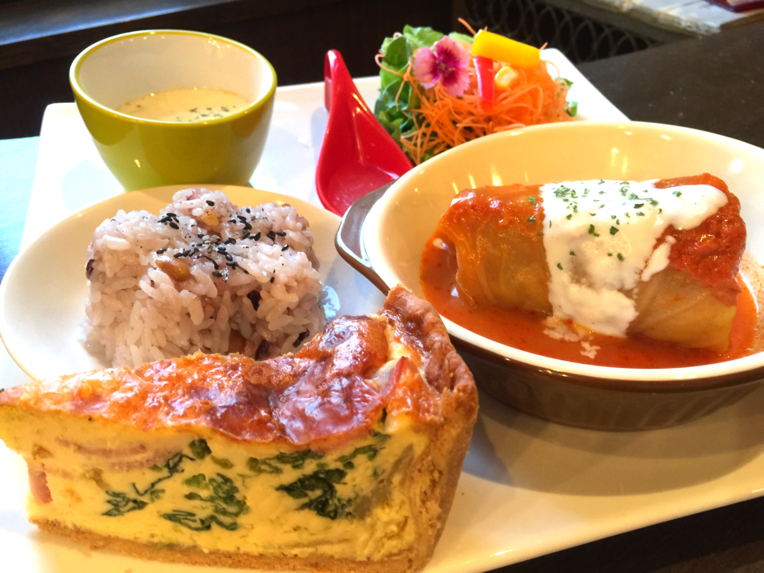 自家製の煮込みロールキャベツと、 フワフワキッシュに、豊明エディブルフラワーを飾ったサラダなどが ワンプレートになったランチです。