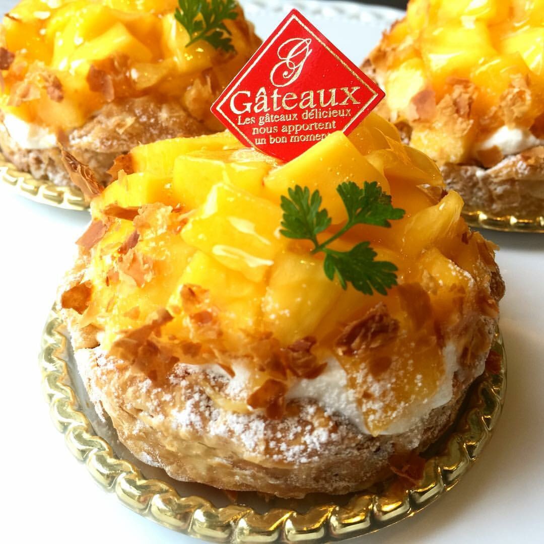 サクサクのパイの上に、レアチーズとマンゴーをのせたケーキです。