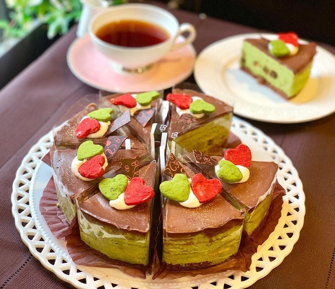 上は生チョコでカバーして、ちょっと豪華に金粉を、ふりかけ✨✨いちごの生チョコ食べ抹茶の生チョコを、ハートの形で飾りました❣️❣️ このケーキとコーヒーを組み合わせれば、バレンタインを満喫できるかもしれません♥️ 皆様のご来店をお待ちしております❤️
