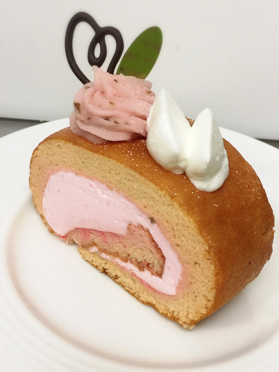 桜のロールケーキは、スポンジの中に、桜の葉や白あんを練りこんで